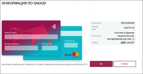 После согласия с правилами тестирования необходимо нажать на кнопку «Подать заявление». На данном этапе откроется страница оплаты. Сумма оплаты составляет 2242 тг.